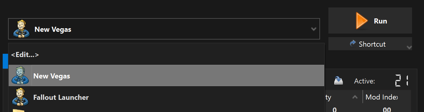 Due to the way Mod Organizer 2 works, running programs through it is a requirement in order to load mods. This is done in the top-right corner of the manager, where the program to run is chosen. Here, select New Vegas, as shown.