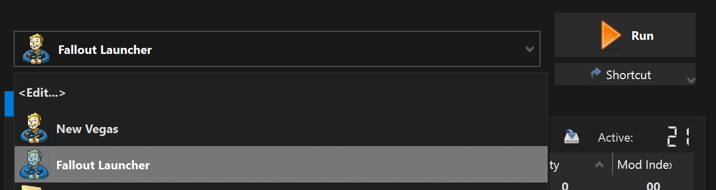 Due to the way Mod Organizer 2 works, running programs through it is a requirement in order to load mods. This is done in the top-right corner of the manager, where the program to run is chosen. Here, select New Vegas, as shown.